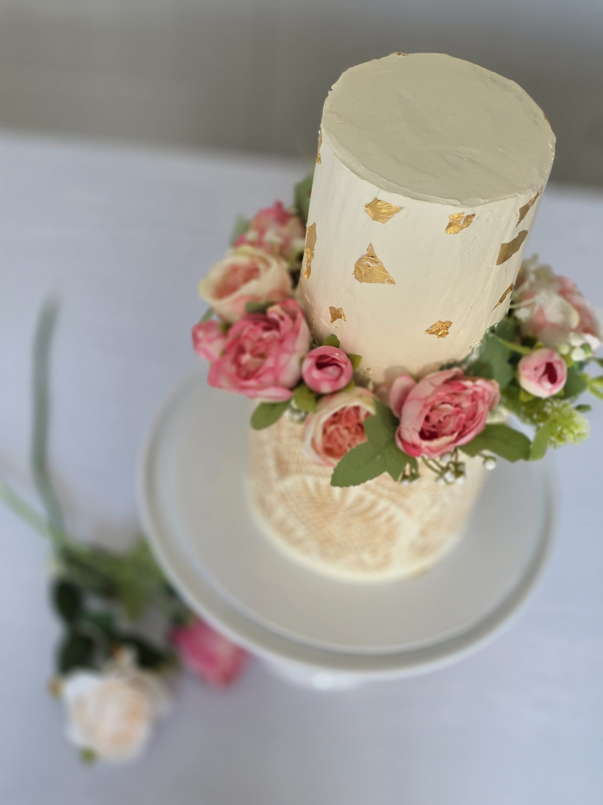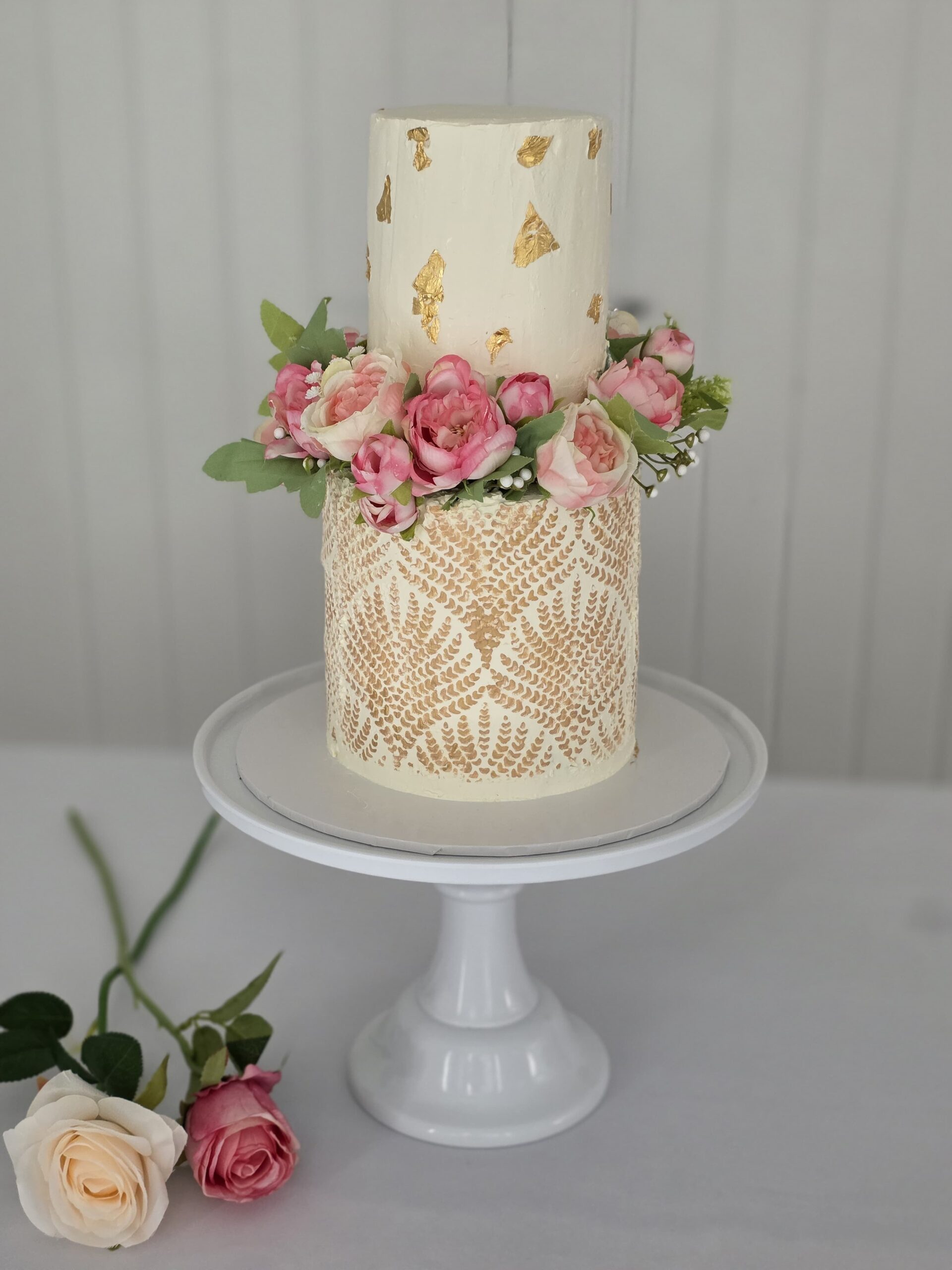 An elegant two-tier cake combining 4 layers of moist vanilla and rich chocolate flavours, filled with silky buttercream and decadent chocolate. Elegantly adorned with intricate gold patterns and soft pink florals.