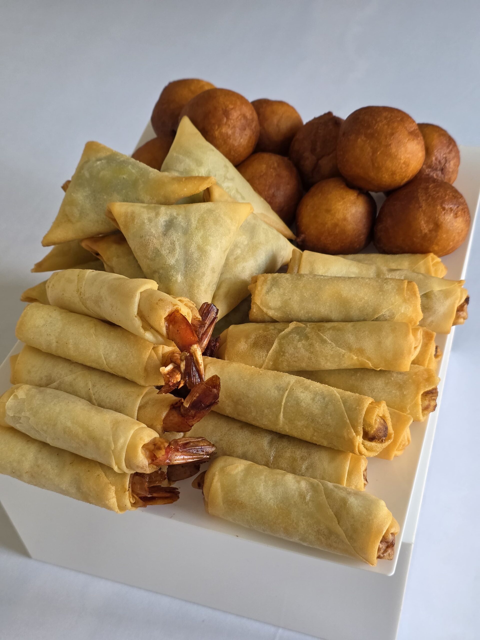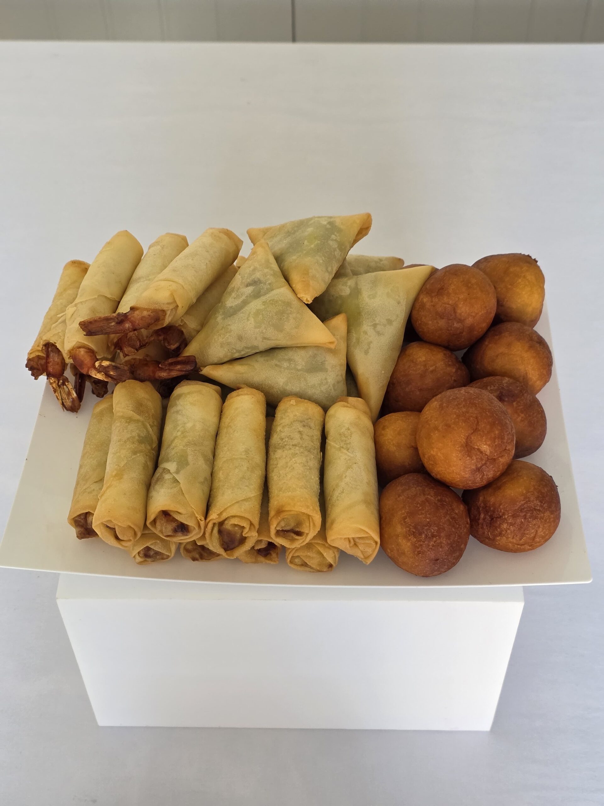 Consists of 10 vegetable spring rolls, 10 beef Samosas, 10 Prawn rolls and 10 puff-puffs.