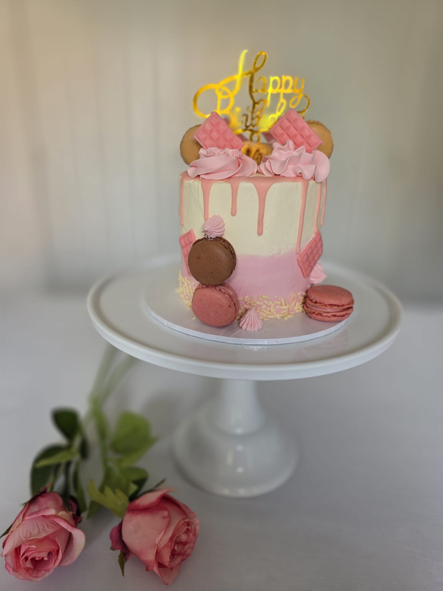 A soft and fluffy vanilla cake beautifully layered in shades of white and pink, adorned with macarons and chocolate bars , perfect for a birthday celebration, 4 layers. Happy Birthday topper included. There may be some variations.