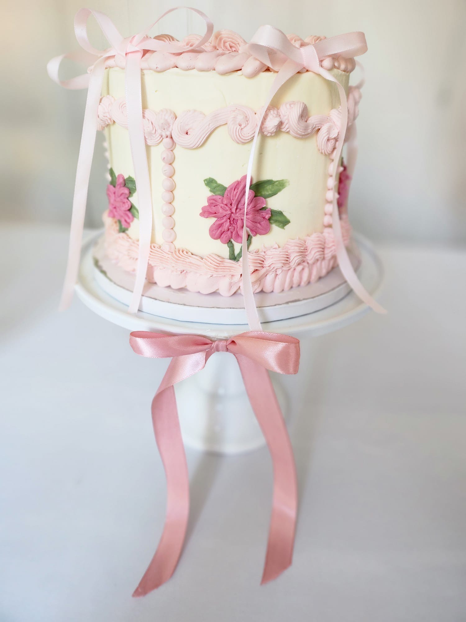 A timeless vintage-style cake crafted with layers of rich Red Velvet and fluffy Vanilla sponge. Elegantly decorated in soft cream and baby pink tones, and adorned with delicate baby pink ribbons, this cake is the perfect blend of classic flavours and nostalgic charm – ideal for adding a touch of elegance to any celebration.